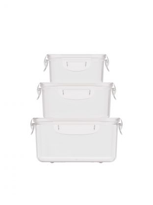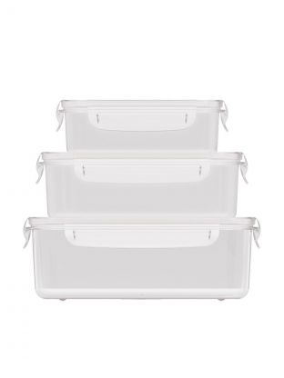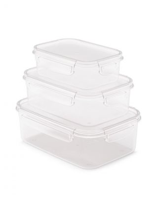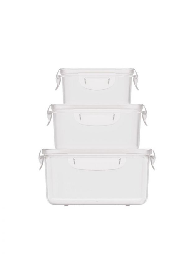 В наборе три контейнера объёмом 0.5, 1 и 1.6 литра, каждый с герметичной крышкой на защёлках, выполнен из безопасного пластика без запаха.