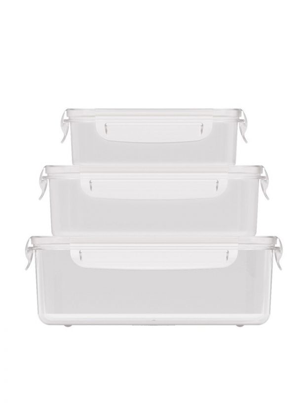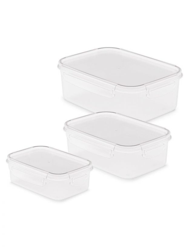 Набор пластиковых пищевых контейнеров 0.5, 1 и 1.6 л с герметичными защёлками — удобно хранить свежесть продуктов дома, на даче, в поездке. Безопасность и универсальность по доступной цене.