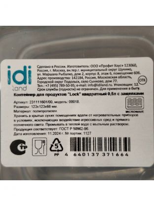 Контейнер пищевой пластик, 0.5 л, 12.3х12.3х6.8 см, IDIland, Lock, 231111601/00