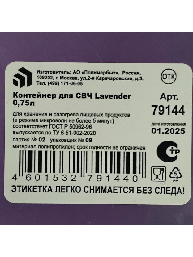 Контейнер пищевой пластиковый 0.75 л Полимербыт Lavender — компактное и герметичное решение для хранения продуктов дома, на даче и в дороге. Идеальный выбор для тех, кто ценит порядок, свежесть и удобство.