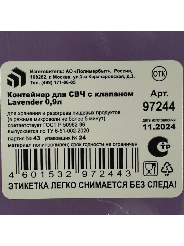 Контейнер пищевой Полимербыт Lavender 0.9 л — компактное хранение и удобство для дома и дачи: клапан для свежести, прочный пластик, стильный дизайн.