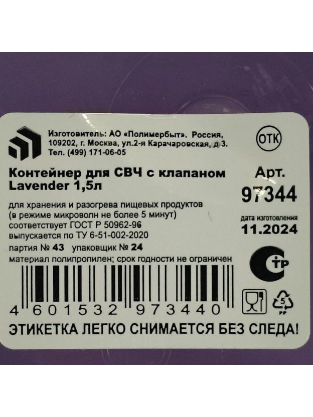 Контейнер пищевой Полимербыт Lavender 1.5 л с клапаном — надежное хранение продуктов дома и на даче, подходит для СВЧ и посудомоечной машины.