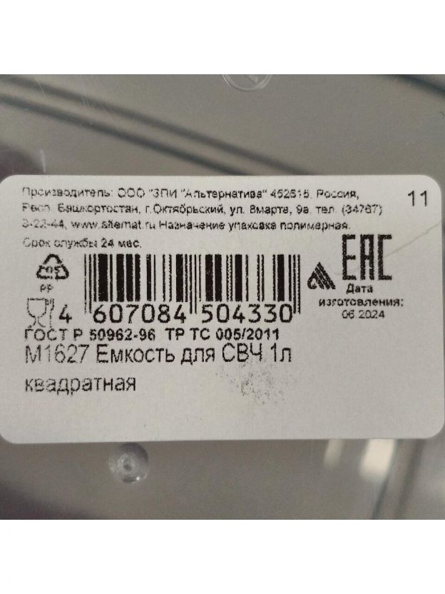 Контейнер пищевой пластик, 1 л, 14.4х14х7 см, в ассортименте, квадратный, Альтернатива, М1627