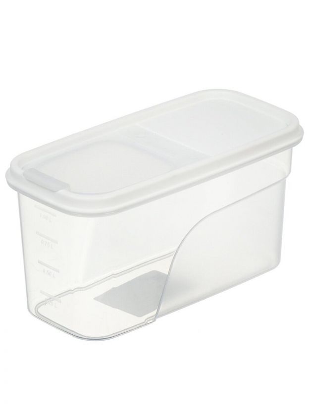 Контейнер имеет объём 1.2 литра, размеры: длина 19 см, ширина 9 см, высота 10 см. Идеально подходит для хранения сыпучих продуктов дома и на даче.