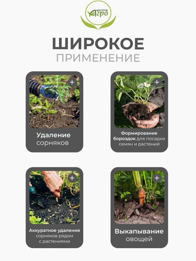 Корнеудалитель Инструм-Агро позволяет точечно удалять корни, не повреждая соседние растения и не разрушая структуру почвы, что особенно важно для поддержания урожайности.