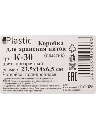 Коробка для хранения ниток, пластик, 23.5х14х6.5 см, прозрачная, К-30