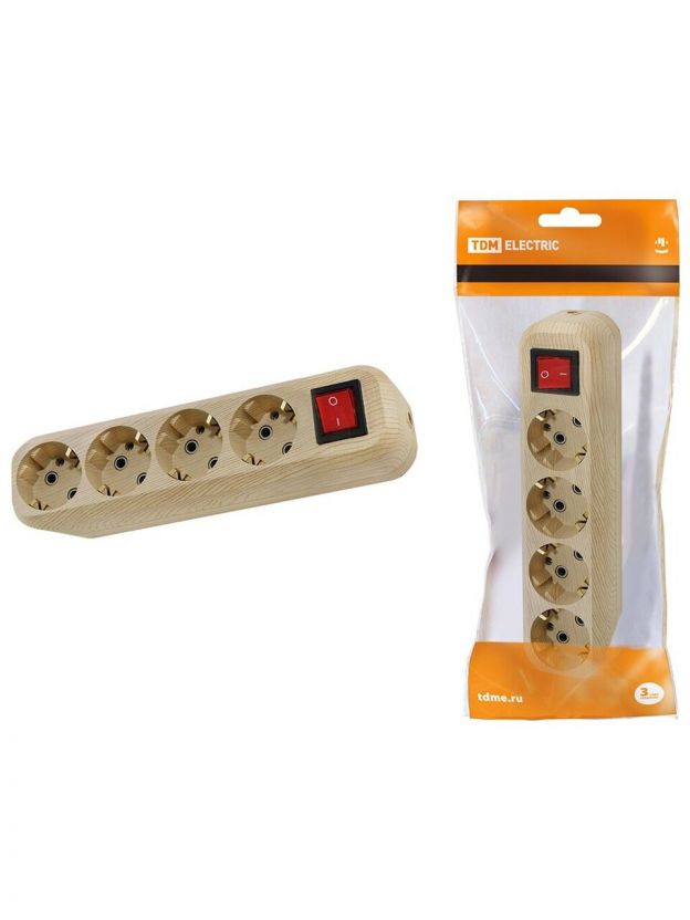 Корпус удлинителя 4 гнезда, 2 + 3, с заземлением, 16 А, выключатель, сосна, TDM Electric, Эко, SQ1806-0052