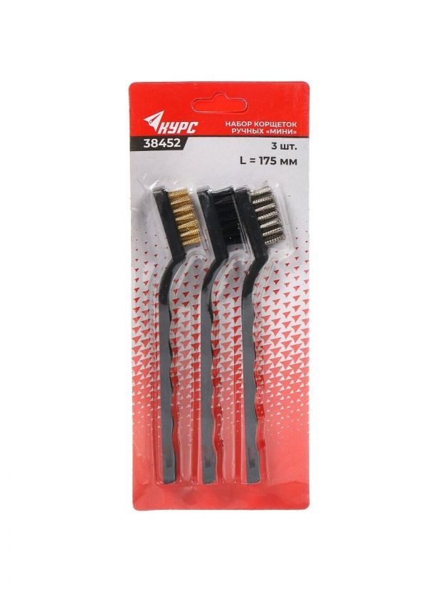 Корщетки ручные мини 3 шт, 2, сталь,нейлон,латунь, рукоятка пластик, 175 мм, Курс, 38452