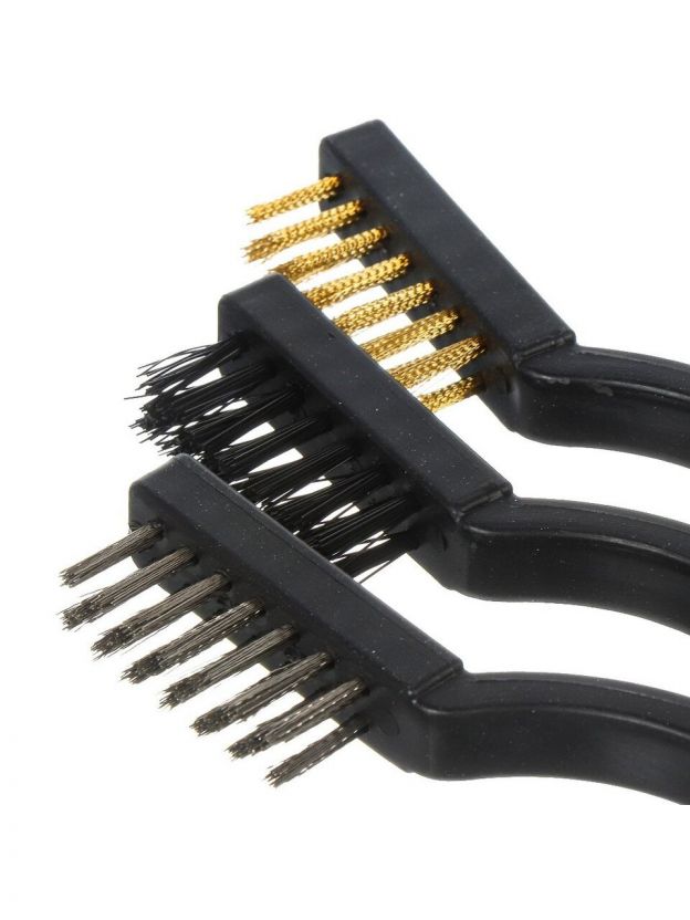 Набор ручных корщеток предназначен для очистки поверхностей узлов и агрегатов, элементов крепежа, деталей механизмов и кузовов автомобилей от старой краски, загрязнений и коррозии. В составе набора три щётки со стальной, латунной и пластиковой щетиной для грубой или аккуратной очистки. Зачистные щётки имеют пластиковые рукоятки. Чаще всего используются для очистки узлов и деталей при ремонте автомобилей, на производстве, а также в домашнем хозяйстве.