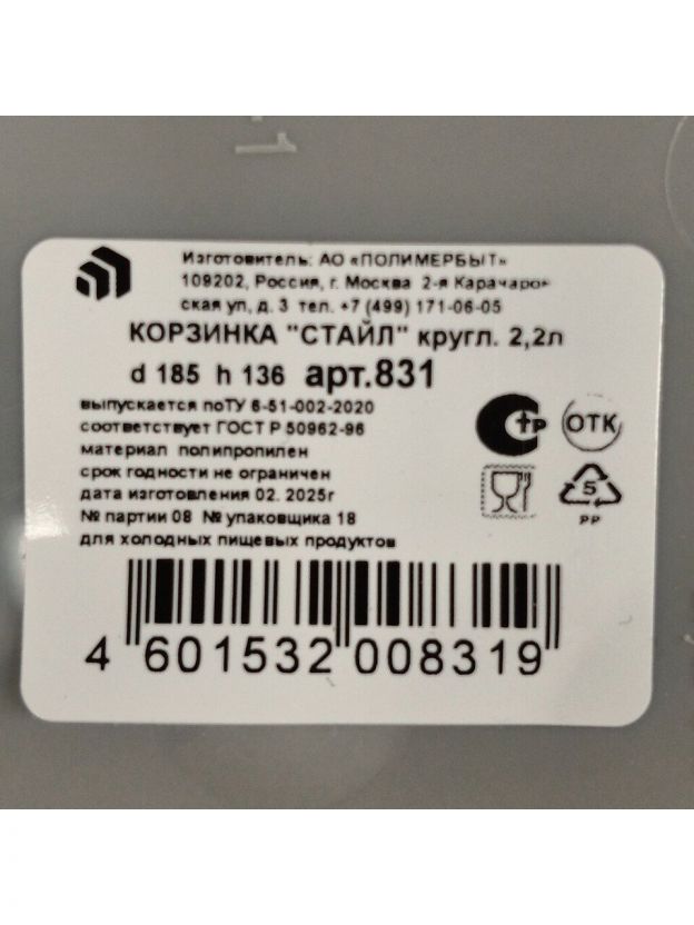 Корзина 2.2 л, 18.5х18.5х13.6 см, круглая, пластик, в ассортименте, с ручками, Полимербыт, С831, 4383100