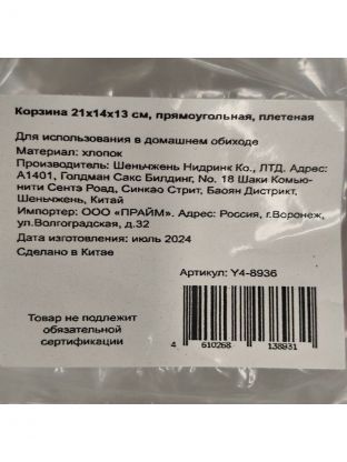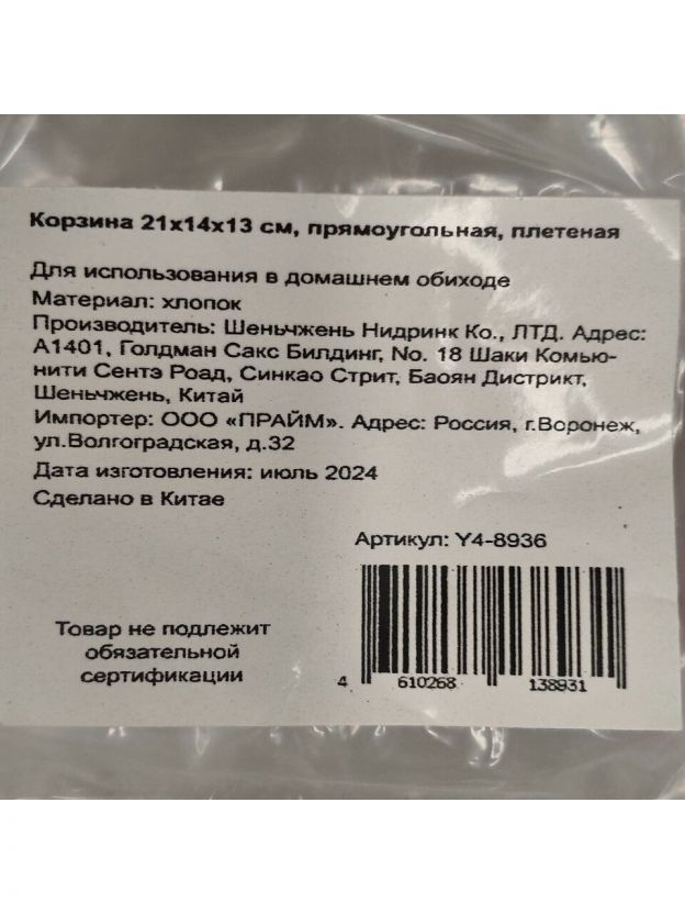Корзина 21х14х13 см, прямоугольная, плетеная, Y4-8936