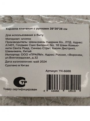 Корзина 26х26х28 см, квадратная, плетеная, с ручками, Y4-8688