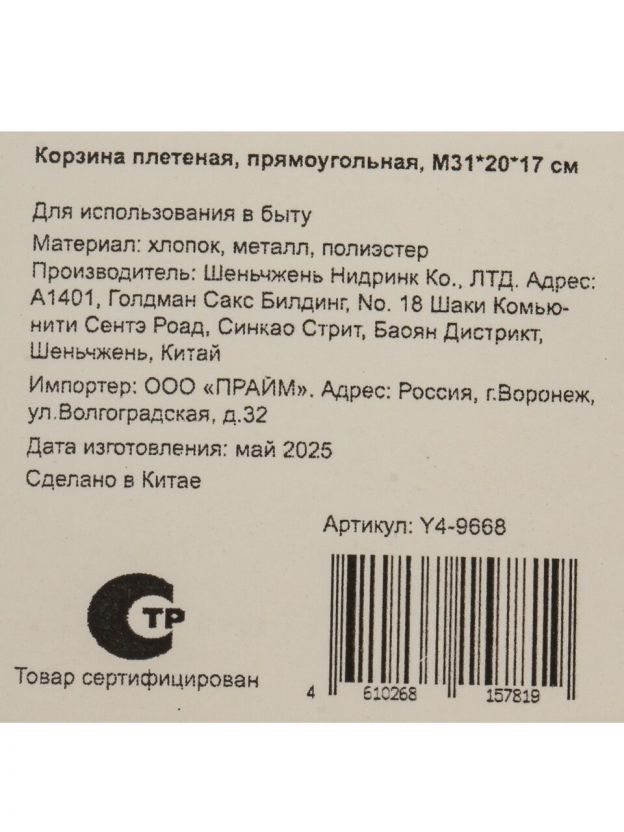 Корзина плетёная прямоугольная 31х20х17 см — это идеальное решение, если вы ищете, какую корзину выбрать для хранения вещей дома, на даче или в офисе. Благодаря прочному сочетанию хлопка, металла и полиэстера, изделие сохраняет форму даже при частом использовании. В отличие от аналогов из ротанга, эта модель легче, не боится влаги и проста в уходе: текстильную вкладку легко вынуть и постирать.