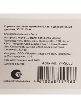 Плетёная корзина изготовлена из прочных и экологичных материалов: хлопка, металла, полиэстера и дерева. Конструкция обеспечивает необходимую жёсткость и долговечность, а деревянные ручки позволяют легко переносить корзину с места на место. Текстильная вкладка защищает хранимые вещи от повреждений и загрязнений, а также облегчает уход за изделием. Корзина не складывается, сохраняя стабильную форму и презентабельный внешний вид даже при активной эксплуатации.