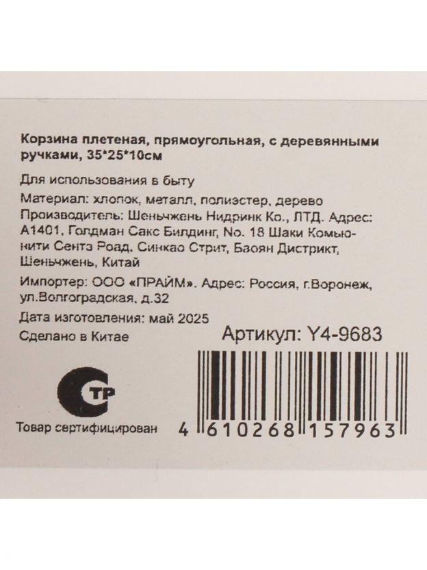 Корзина 35х25х10 см, прямоугольная, плетеная, с деревянными ручками, Y4-9683