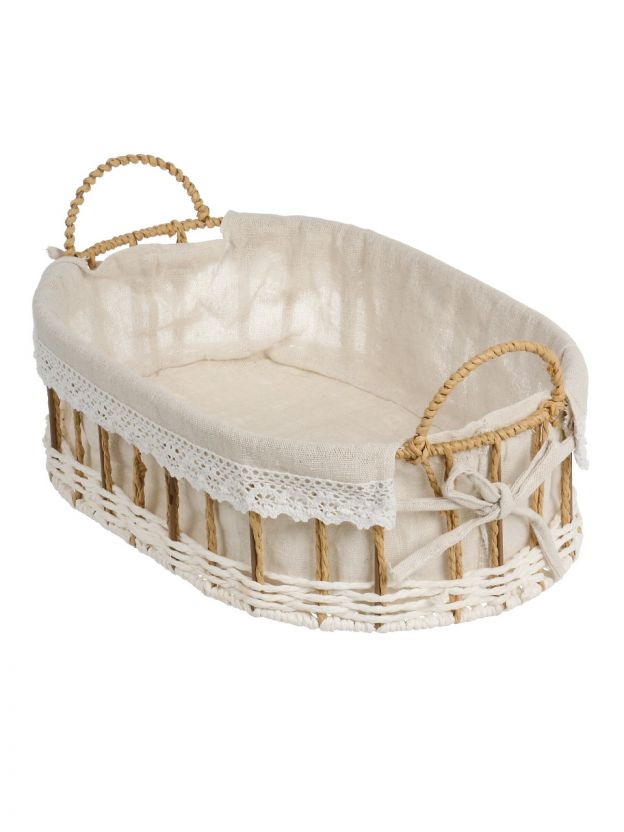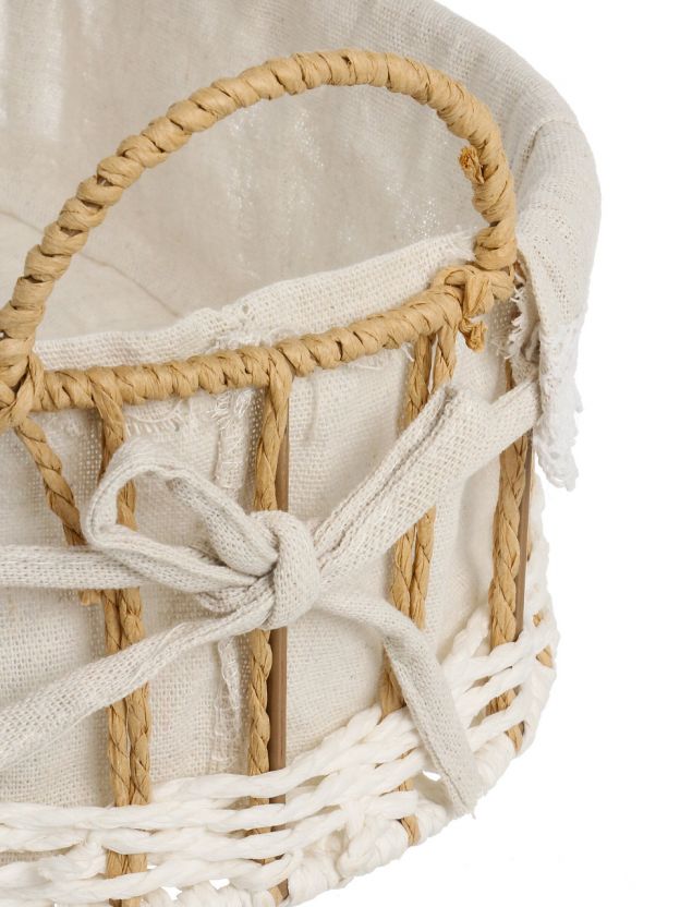 Корзина выполнена из хлопка, металла и полиэстера, без крышки, но с текстильной вкладкой и ручками для переноски.