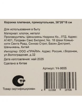 Корзина 36х26х18 см, прямоугольная, плетеная, Y4-9655