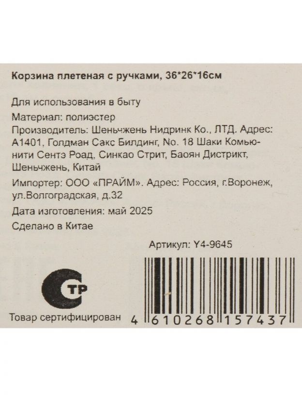 Покупка корзины 36х26х16 см с ручками Y4-9645 — это шаг к организованному и уютному дому. Рациональное хранение вещей, легкость использования и привлекательный внешний вид делают ее выгодным приобретением для поддержания порядка и комфорта в любом помещении.