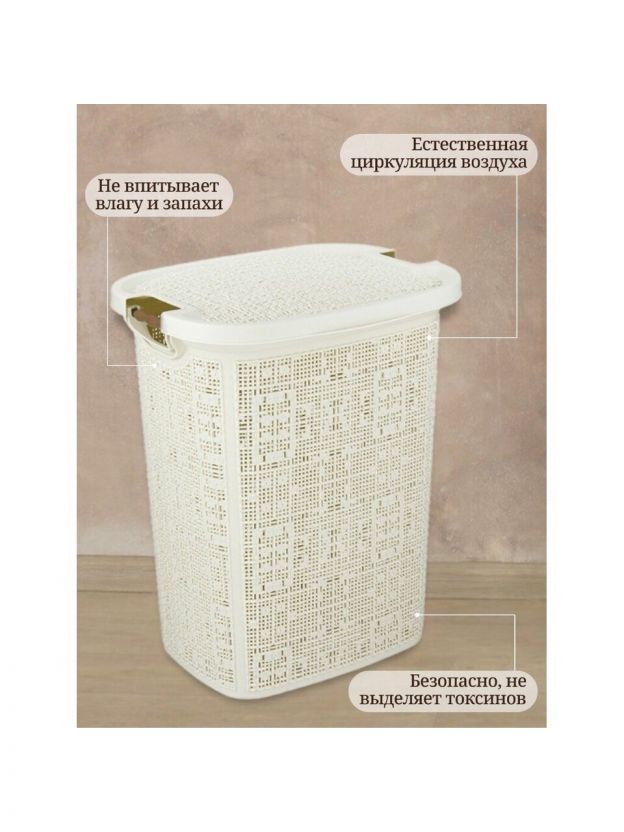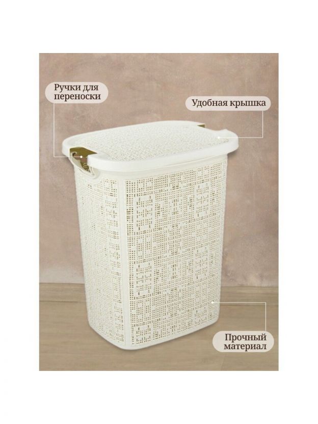 Корзина для белья, 30 л, 36х29х44.5 см, прямоугольная, плетеная, пластик, белый ротанг, с крышкой, Idea, Бязь, М 2622