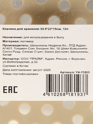 Корзина рассчитана на 12 литров, оптимальна для хранения одежды, игрушек, бытовых аксессуаров, косметики. Размеры: 34.5 см ширина, 23 см глубина, 15 см высота.