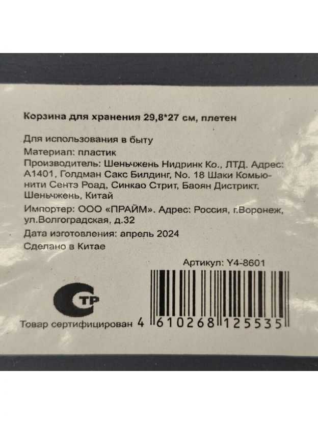 Корзина для хранения, 27х29.8 см, плетеная, пластик, серая, Y4-8601