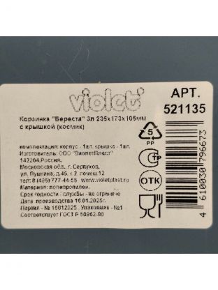 Корзина для хранения Violet "Береста" объемом 3 л — стильное и практичное решение для организации пространства дома и дачи. Прямоугольная форма и компактные размеры позволяют удобно разместить аксессуары, мелкие вещи или бытовые принадлежности. Крышка защищает содержимое от пыли, а ручки обеспечивают легкость переноски.