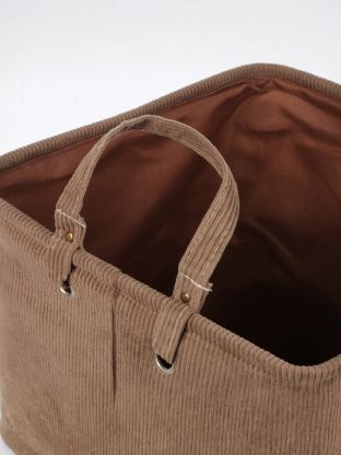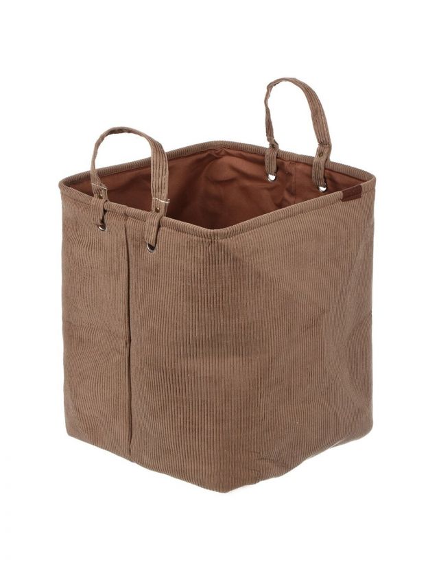 Размер: ширина 33 см, глубина 33 см, высота 39 см. Материал — коричневый вельвет, складная конструкция, удобные ручки для переноски.