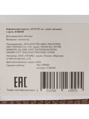 Корзина для хранения из коричневого вельвета с ручками — современное решение для организации пространства. Благодаря оптимальному размеру 33x33x39 см она подходит для хранения одежды, игрушек, аксессуаров, вязальных принадлежностей. Мягкая текстура вельвета приятна на ощупь и визуально добавляет уюта в интерьер. Складная конструкция позволяет легко убрать корзину, когда она не нужна — это удобно для малогабаритных квартир и сезонного использования на даче.