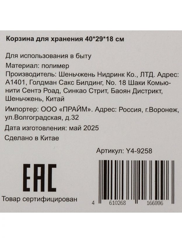 Корзина имеет размеры 40 см в ширину, 29 см в глубину и 18 см в высоту. Это позволяет хранить как крупные, так и мелкие предметы.
