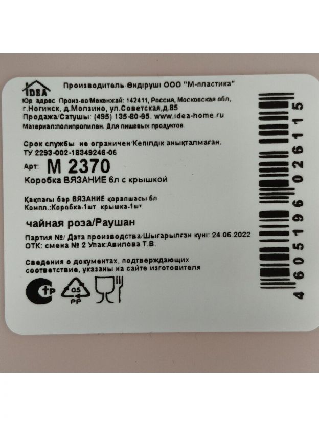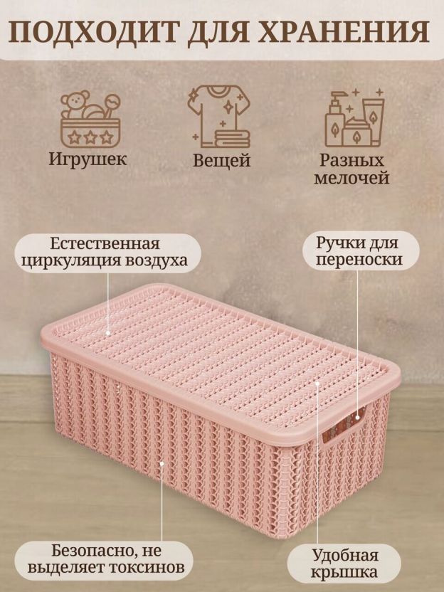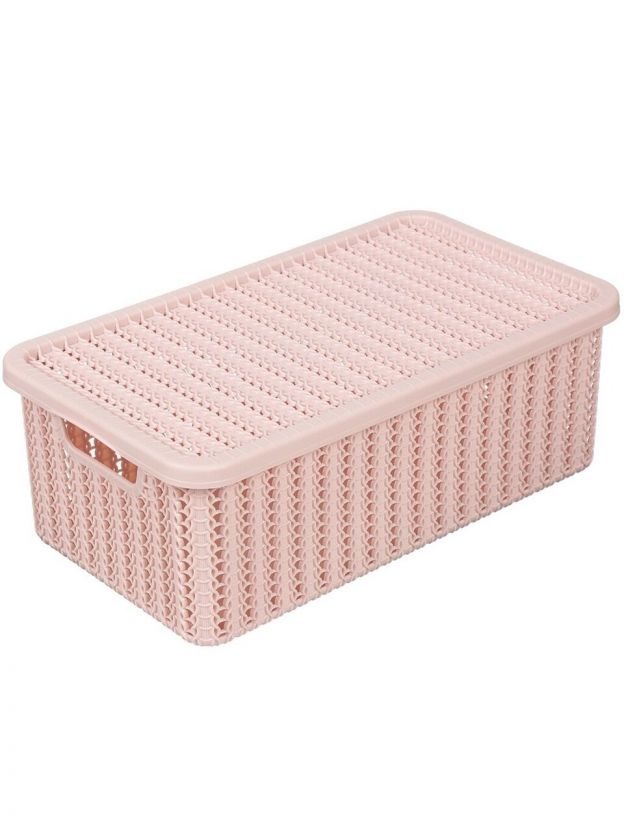Корзина для хранения, 6 л, прямоугольная, плетеная, пластик, чайная роза, с крышкой, Idea, Вязание, М2370