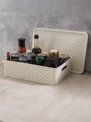Емкость из пищевого пластика для хранения и переноски мелких аксессуаров и продуктов питания. В объеме 7.5 л корзинки оптимальны для хранения товаров для рукоделия, свежих фруктов и ягод, бакалеи или консервов. С врезными ручками обтекаемой формы корзинки удобно перемещать. Бортик по периметру крышек обеспечивает фиксацию при штабелировании корзинок друг на друга. Узор "Береста" по всему корпусу и крышке придает корзинкам натуральный вид и делает их легкими и проветриваемыми.