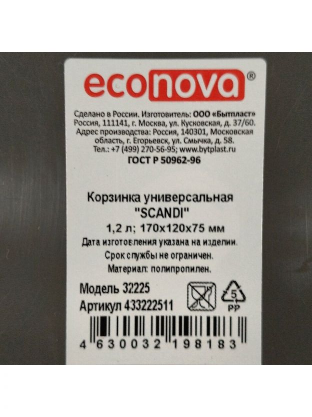Корзина универсальная, 1.2 л, 17х12х7.5 см, прямоугольная, пластик, серая, Бытпласт, Scandi, 433222511