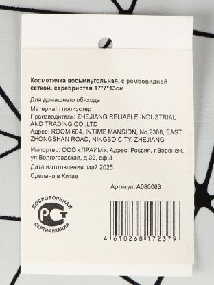 Если вы ищете, какую косметичку выбрать для ежедневного использования или поездок, обратите внимание на восьмиугольную модель с ромбовидной сеткой. Такой аксессуар помогает быстро находить нужные средства благодаря прозрачной структуре и эргономичной форме. Серебристая расцветка выглядит современно и не маркая, а благодаря компактным размерам косметичка легко помещается в рюкзак, чемодан или сумку.