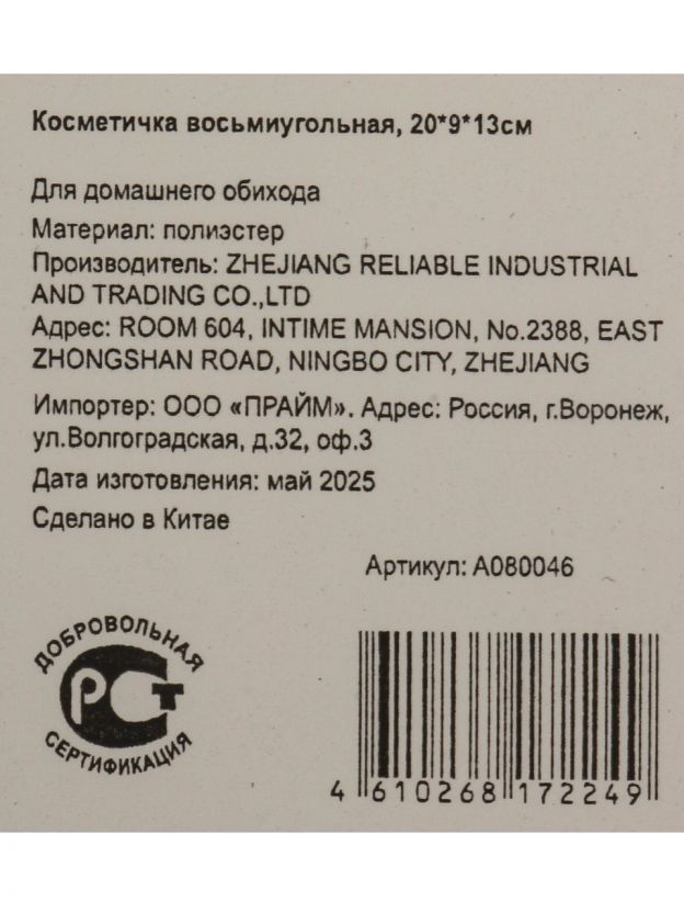 Многие ищут, «что лучше для хранения косметики дома и на даче» — восьмиугольная конструкция позволяет разместить даже нестандартные флаконы и кисти, а также быстро найти нужную вещь. В отличие от моделей без каркаса, косметичка A080046 держит форму, не промокает и подходит для частого использования. Если вы задаётесь вопросом, «подходит ли для подарка косметичка», — лаконичный дизайн и универсальный размер делают её уместной для любого случая.