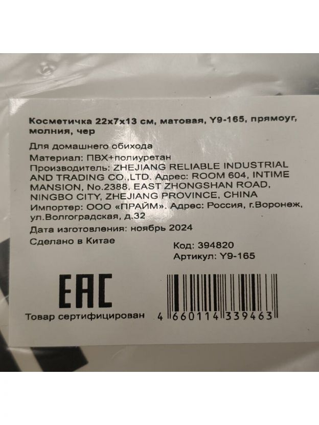 Косметичка 22х7х13 см, матовая, Y9-165, прямоугольная, застежка молния, черная
