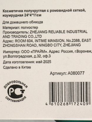 Косметичка выполнена из прочного материала с ромбовидной сеткой, полукруглой формы, застежка — молния. Цвет — изумрудный (зеленый), страна продавца — Китай.