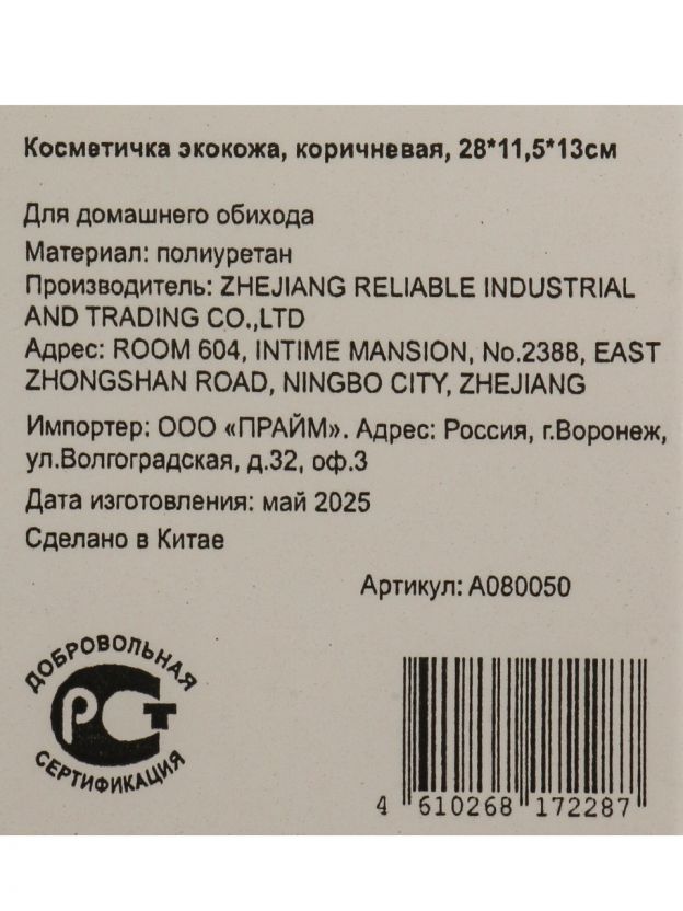 Косметичка из экокожи — оптимальный выбор для тех, кто ищет практичный и современный аксессуар. Экокожа долговечна, устойчива к влаге и проста в уходе, а коричневый цвет не маркий и подходит к любому стилю. Внутренний объём 28x11.5x13 см позволяет удобно разместить косметику, уходовые средства или аксессуары для путешествий.