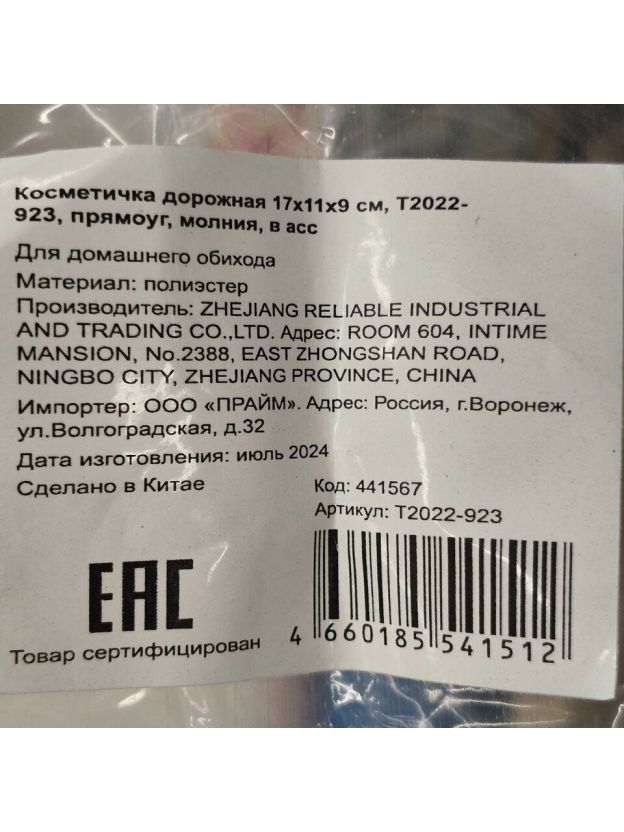 Косметичка дорожная 17х11х9 см, T2022-923, прямоугольная, застежка молния, в ассортименте