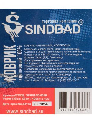 Коврик 0.55х1 м, Sindbad, прямоугольный, многоцветный, хлопковый, хлопок, толщина 4 мм, ручное плетение, 6080