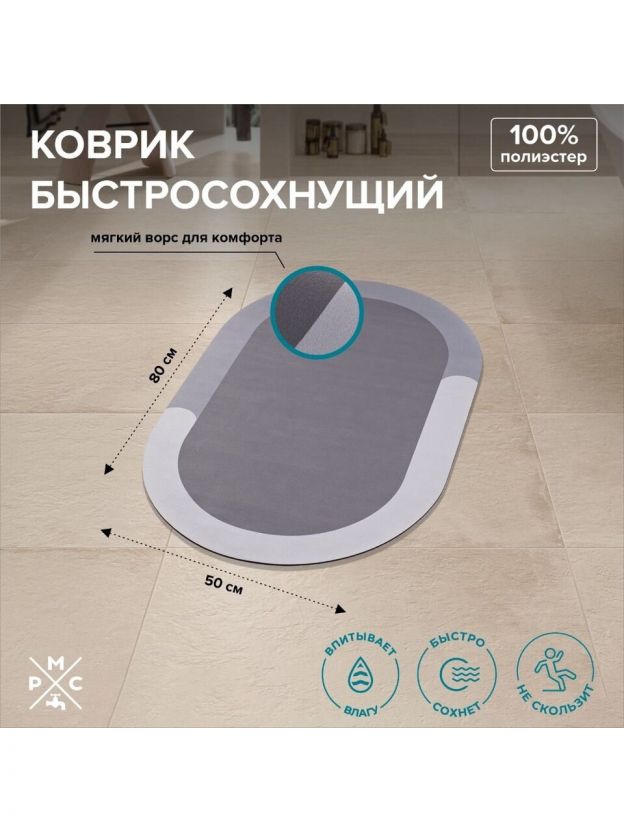 Коврик быстросохнущий для ванны, антискользящий, 0.5х0.8 м, полиэстер, РМС, К-03С-50х80