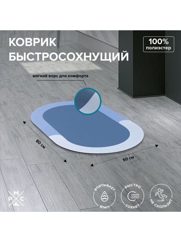 Коврик быстросохнущий для ванны, антискользящий, 0.5х0.8 м, полиэстер, РМС, К-03СН-50х80