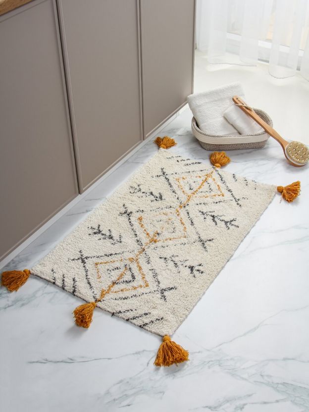 Стильный хлопковый коврик для ванной 0.5x0.8 м с бежевыми ромбами и кисточками Silvano Лиона — уют и безопасность для вашего дома по выгодной цене.