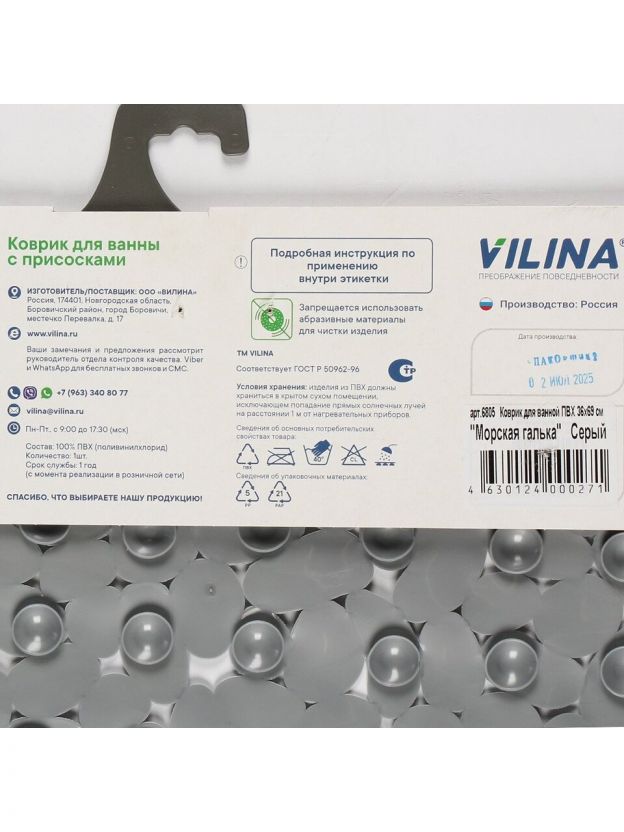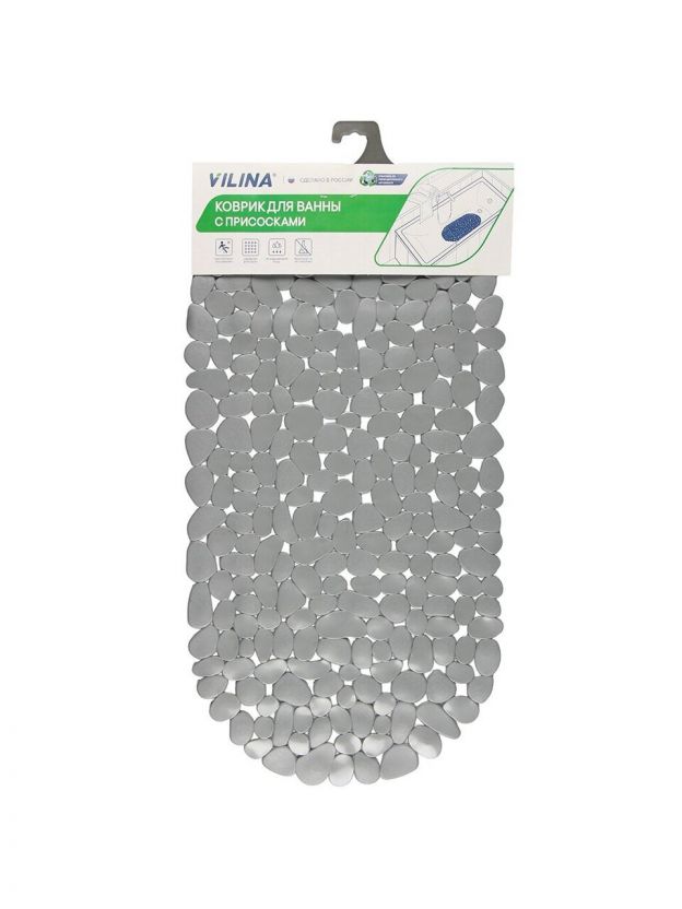 Коврик для ванной Вилина — стильное и практичное решение для безопасности и уюта в ванной комнате. Серый цвет и рисунок морская галька гармонично впишутся в современный интерьер, а антискользящая поверхность и прочный ПВХ обеспечат комфорт и защиту от падений. Размер 36х69 см идеально подходит для большинства ванн.