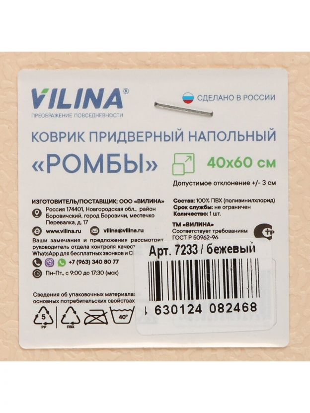 Коврик изготовлен из высококачественного ПВХ, что гарантирует долговечность и простоту ухода. Материал устойчив к влаге, не впитывает воду и быстро сохнет, предотвращая образование неприятных запахов и плесени. Антискользящая поверхность обеспечивает максимальную безопасность даже при попадании воды, что особенно важно для семей с детьми и пожилыми людьми.