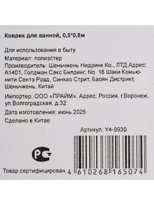 Коврик изготовлен из влаговпитывающего полиэстера с латексной основой, что обеспечивает быстрый отвод влаги и надежное сцепление с полом. Антибактериальная пропитка отсутствует.