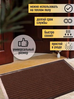 Покрытие можно использовать в качестве придверного коврика, ковровой дорожки в прихожих, коридорах, холлах квартир, офисов и загородных домов. Этот коврик имеет высококлассный, элегантный внешний вид. Резиновые коврики с ковровой поверхностью обладают влаго-грязезащитными функциями и отлично смотрятся в интерьере.