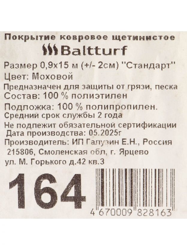Коврик грязезащитный, 90х1500 см, прямоугольный, пластик, в рулоне, моховой, щетинистое покрытие, без рисунка, 164