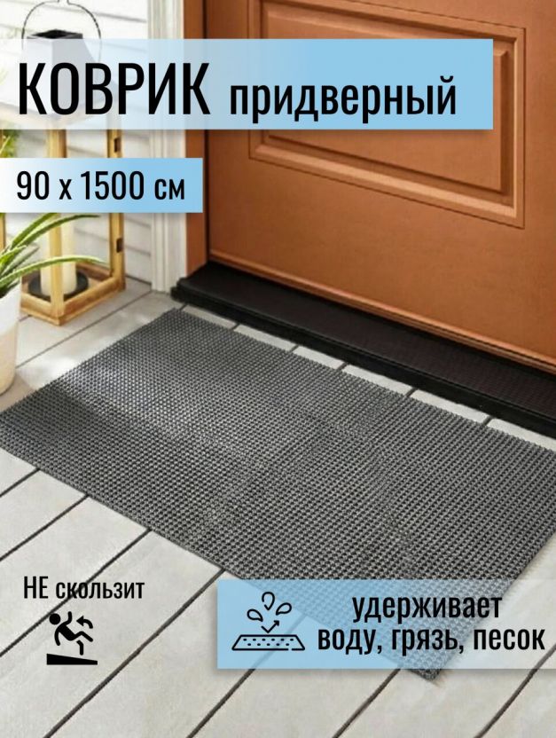 Коврик грязезащитный, 90х1500 см, прямоугольный, пластик, в рулоне, серый, мокрый асфальт, Травка