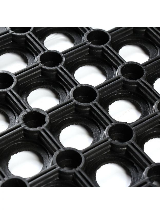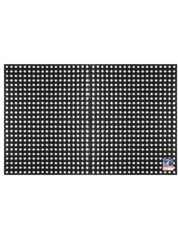 Коврик имеет сквозные отверстия, благодаря которым вода и грязь легко проходят сквозь него, обеспечивая чистоту и сухость поверхности. Прямоугольная форма и классический черный цвет позволят ему гармонично вписаться в любой экстерьер, подчёркивая стиль и практичность вашего дома.