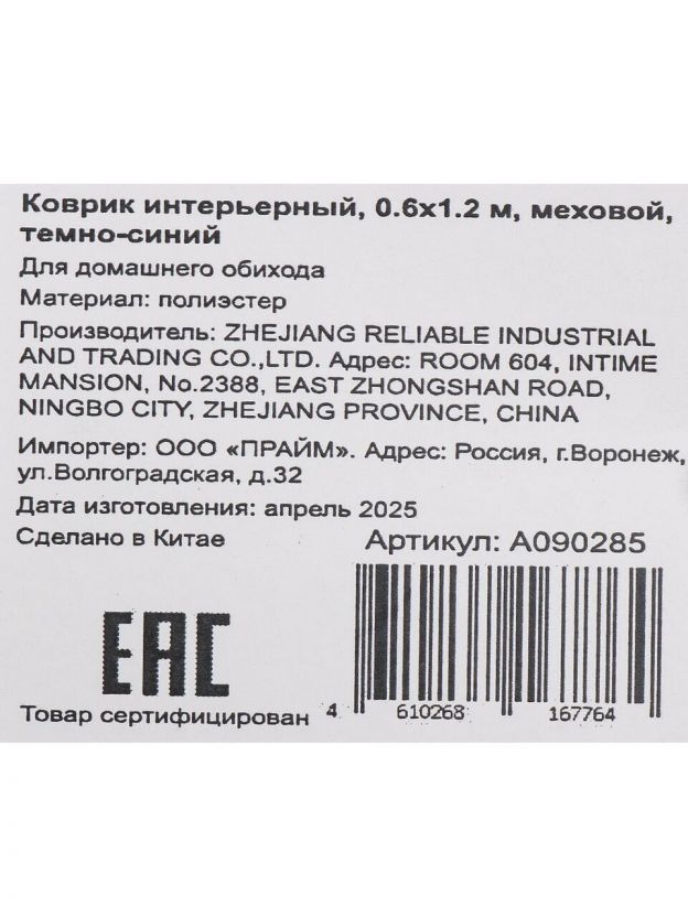 Размер 0.6х1.2 м, прямоугольная форма, материал — искусственный мех, цвет — темно-синий, страна производства — Китай.